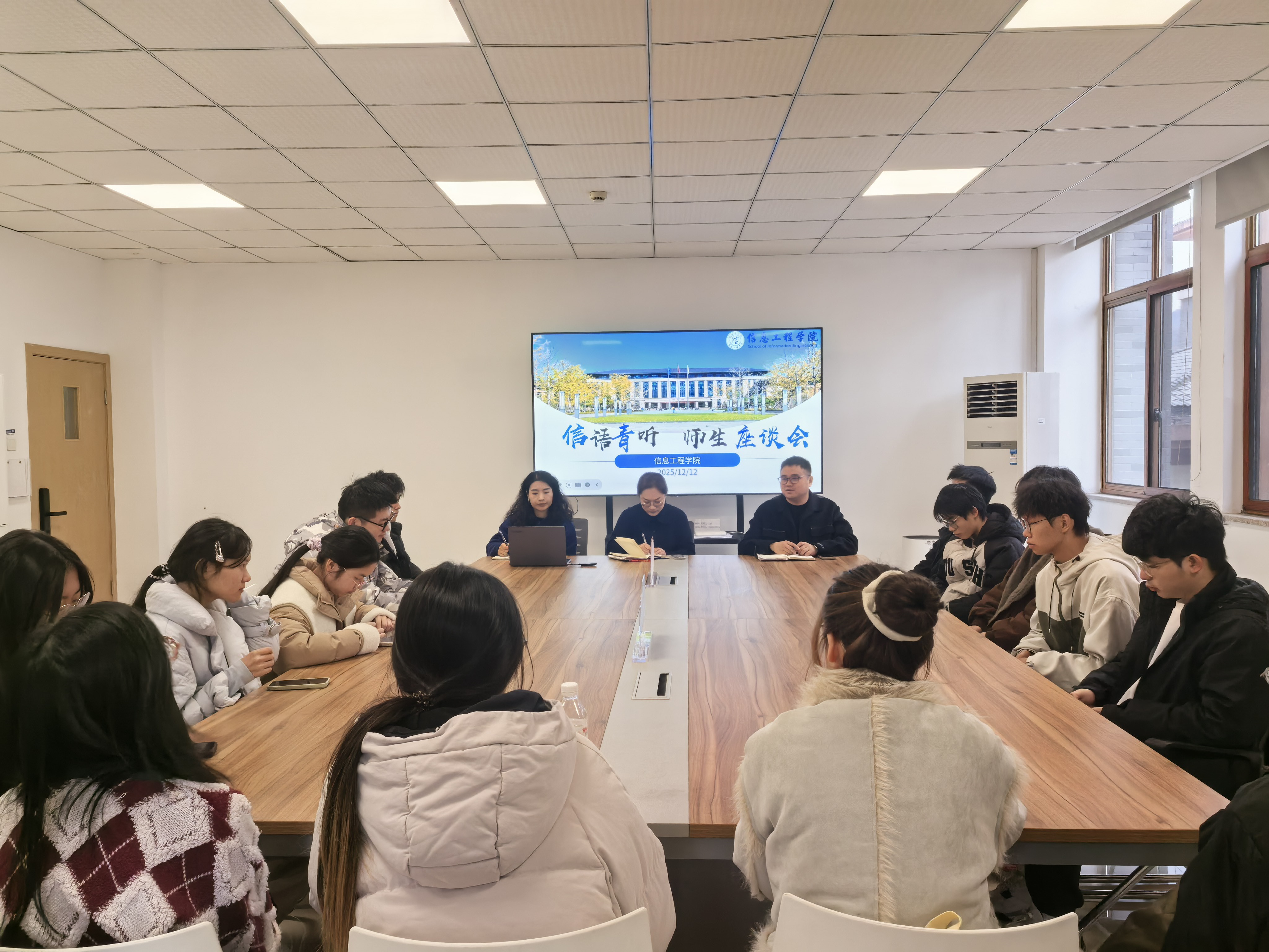 为深入了解大三学生成长需求,助力学生明确未来方向,12月12日,信息工程学院在19-215会议室举办了“信语青听”第二期学生座谈会。学院党总支副书记孔瑜、学办负责人许明星、辅导员黄海芸与大三优秀学生代表面对面,共话未来规划、实习分配、考研升学、考公、就业等热点。