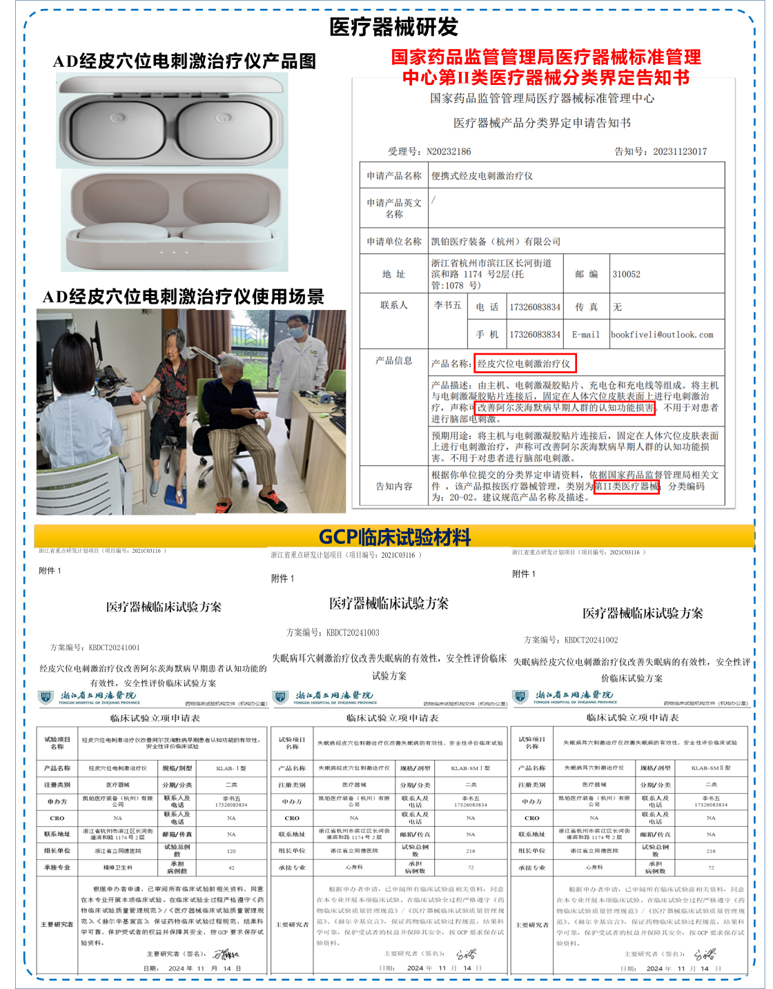 ⑫2021年,李凯教授获批浙江省重点研发计划(项目编号:2021C03116),探讨基于数字生物标志物的神经系统疾病筛查和康复设备研发;李凯教授团队研发了用于改善阿尔茨海默病早期人群认知功能障碍的经皮穴位电刺激治疗仪,以及用于改善失眠的失眠病经皮穴位电刺激治疗仪、失眠病耳穴刺激治疗仪,已生产出产品样机,其中经皮穴位电刺激治疗仪经国家药品监管管理局鉴定为第II类医疗器械(受理号:N20232186),目前正在开展三种电刺激治疗仪的GCP临床试验,还研发了智能辨证经皮电刺激药械组合治疗仪(专利申请号:20231048643)和经皮穴位电刺激仪智能辨证论治控制系统V1.0(软件著作权登记号:2023SR0378044);李凯教授研发了一种用于认知功能评估和AD风险筛查的阿尔茨海默病认知功能辅助诊断系统,现已生产出产品样机,目前正在开展GCP临床试验。部分材料见图3-73。