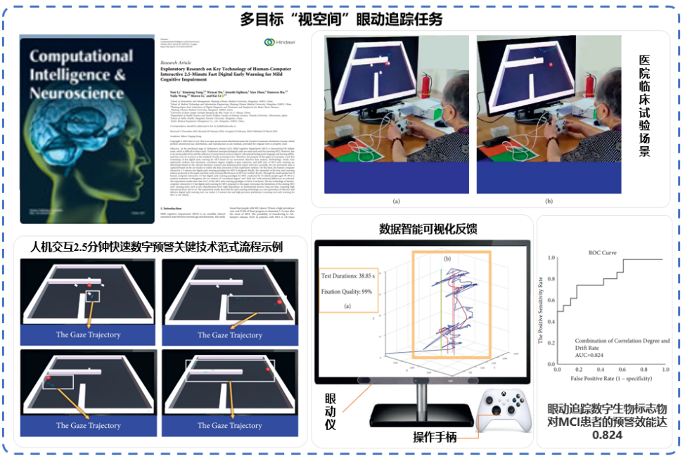 ①李凯教授所在的浙江省国际联合实验室(浙江-日本脑部重大疾病中西医结合数字诊疗及装备国际联合实验室)与早稻田大学研究人员联合研发了一种基于多目标“视空间”眼动追踪任务的AD早期2.5分钟快速数字预警新方法,并在国际上首次提出用于AD早期数字快速筛查的“游离率”、“相关度”两种基于多目标“视空间”眼动追踪任务的数字生物标志物(ComputationalIntelligenceandNeuroscience2022),该2.5分钟人机交互AD预警技术比国际上最快的日本Koh Tadokoro等人提出的3分钟眼球追踪测试预警技术时间提升30秒,对MCI的预警效能为82.4%,提升7.4%;对AD早期的预警效能为92%,提升2%,见图3-61。