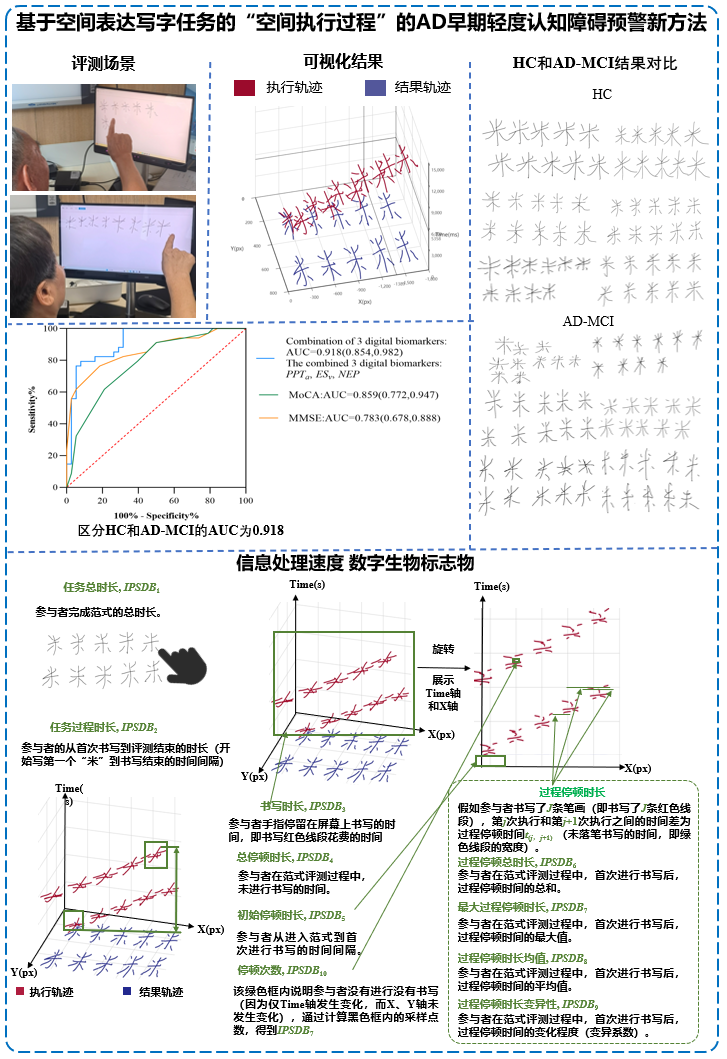 ⑤与陈彤(解放军总医院)合作,沿用指尖交互行为模式,并对空间表达写字任务进行改进,提出了一种准确率更高的动态评测“空间执行过程”的阿尔茨海默病轻度认知障碍预警新方法(FrontiersinComputationalNeuroscience2025),提取的写字数字生物标志物对NC和AD源性MCI患者的联合预警效能为0.918,见图3-66。