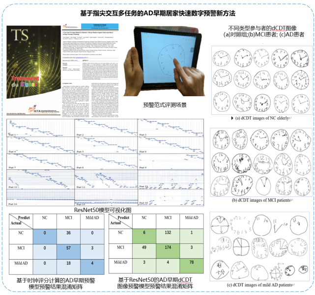③与陈彤(解放军总医院)、日本东京理科大学研究人员合作研发了一种能满足社区无医生情况下对AD患者进行大规模筛查的基于指尖交互多任务的AD早期居家快速数字预警新方法(TraitementduSignal2022),该方法对NC对照、AD 源性MCI患者和轻度AD患者三类人群的综合预警准确率为85%,优于传统的基于时钟评分计算的AD早期预警模型,见图3-63。
