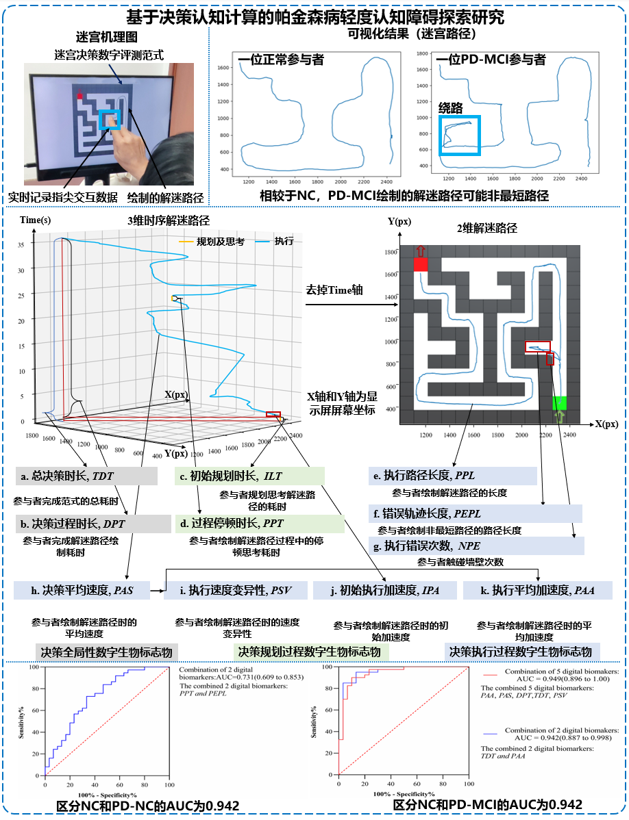 ④与陈彤(解放军总医院)合作研发了研制了基于决策认知计算的帕金森病轻度认知障碍探索研究(FrontiersinNeuroscience2025),通过数字化迷宫任务,提取决策认知数字生物标志物,对NC和PD-MCI的预警效能为0.942,见图3-65。