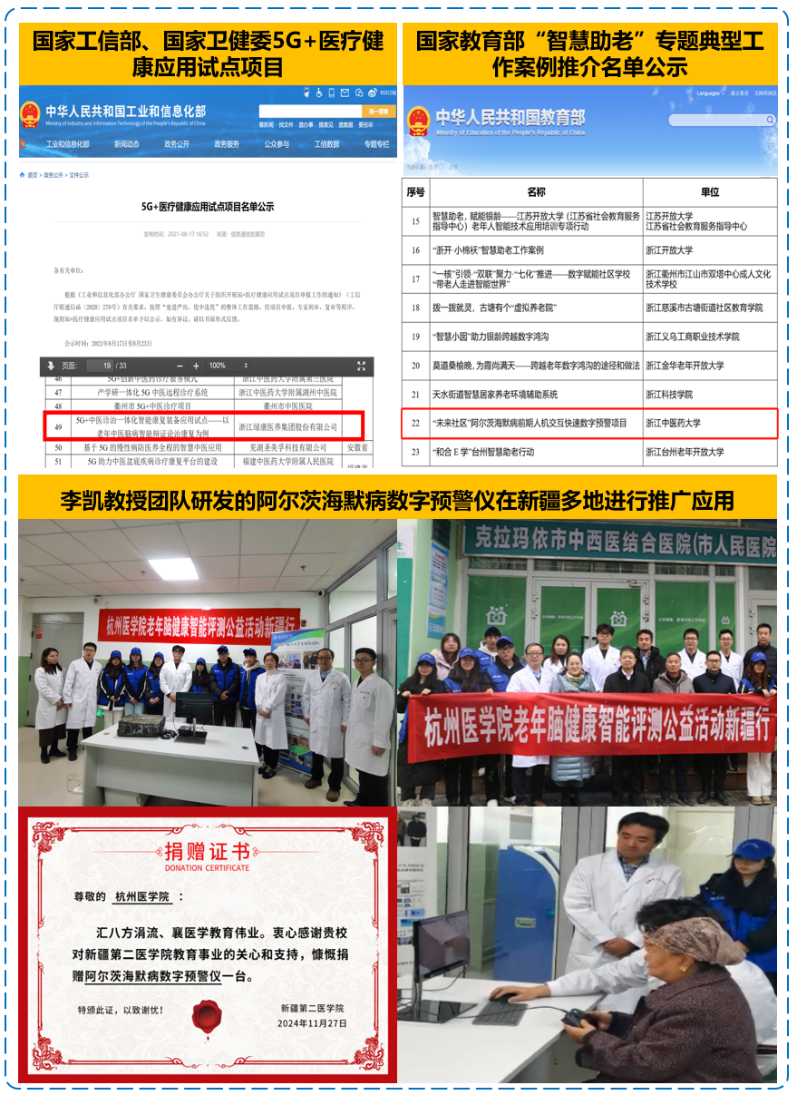 ⑬李凯教授团队的部分研究成果入选国家工信部、国家卫健委5G+医疗健康应用试点项目和中国国家教育部“智慧助老”优质工作案例——《“未来社区”阿尔茨海默病前期人机交互快速数字预警》,且已在多地推广,见图3-74。